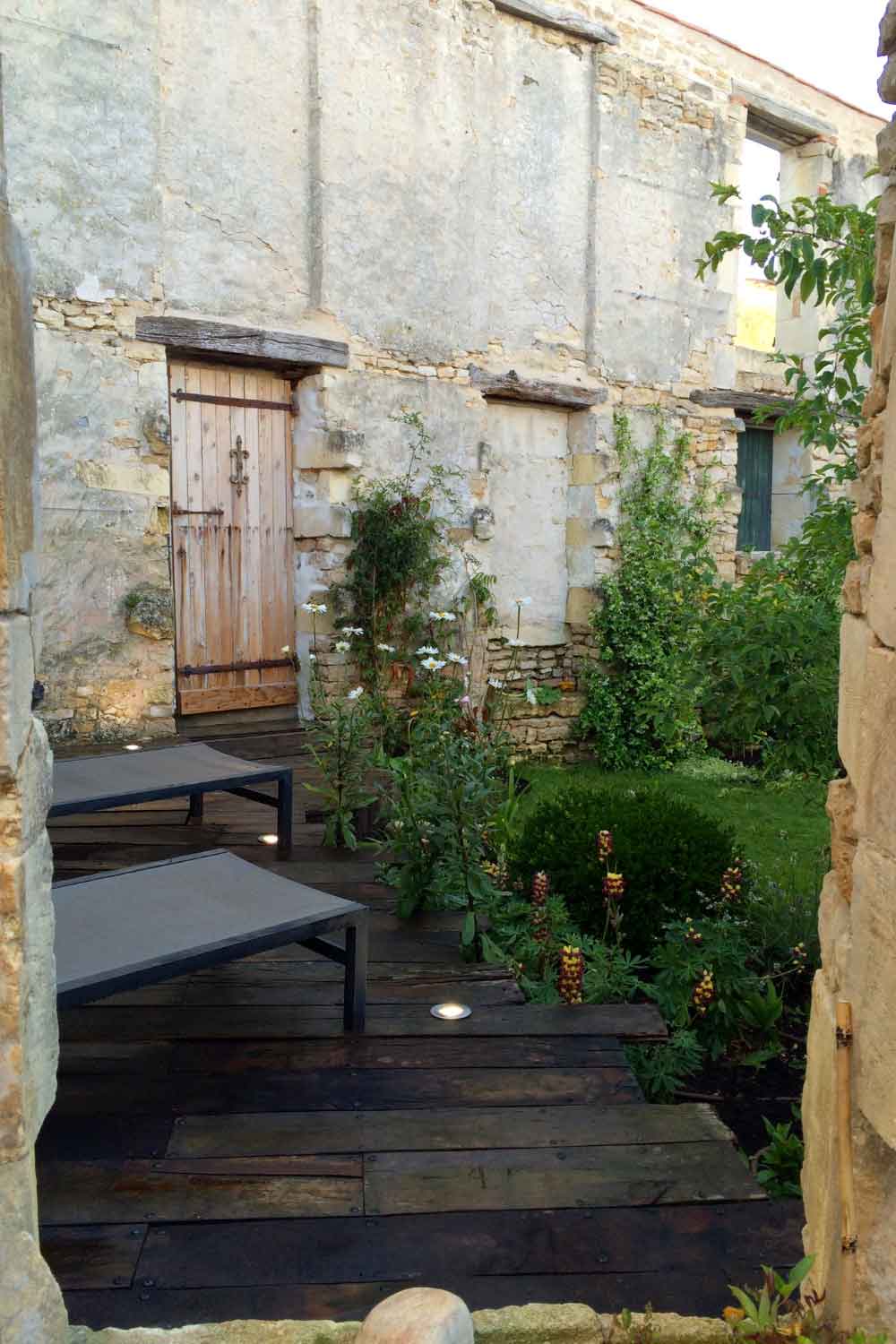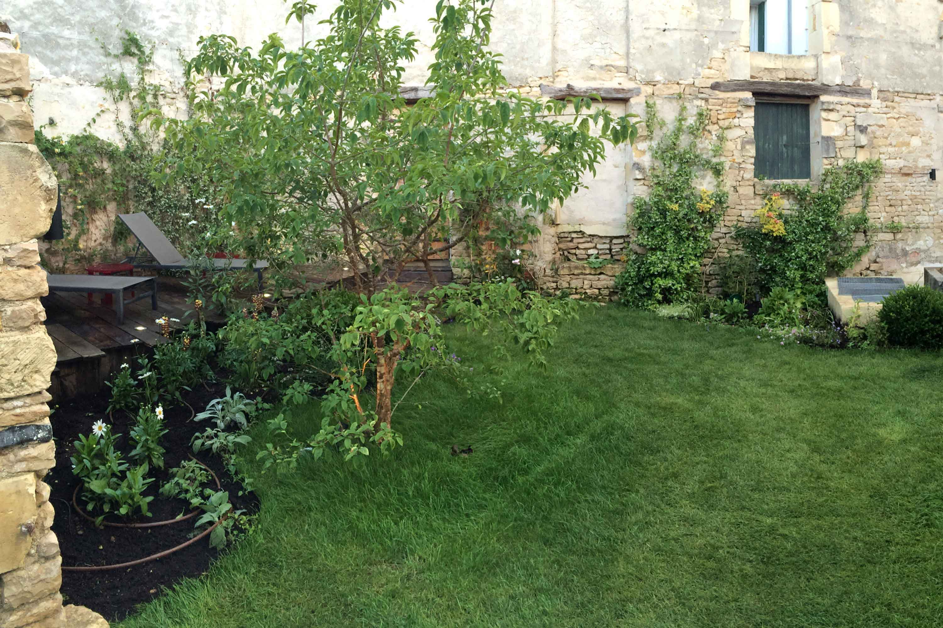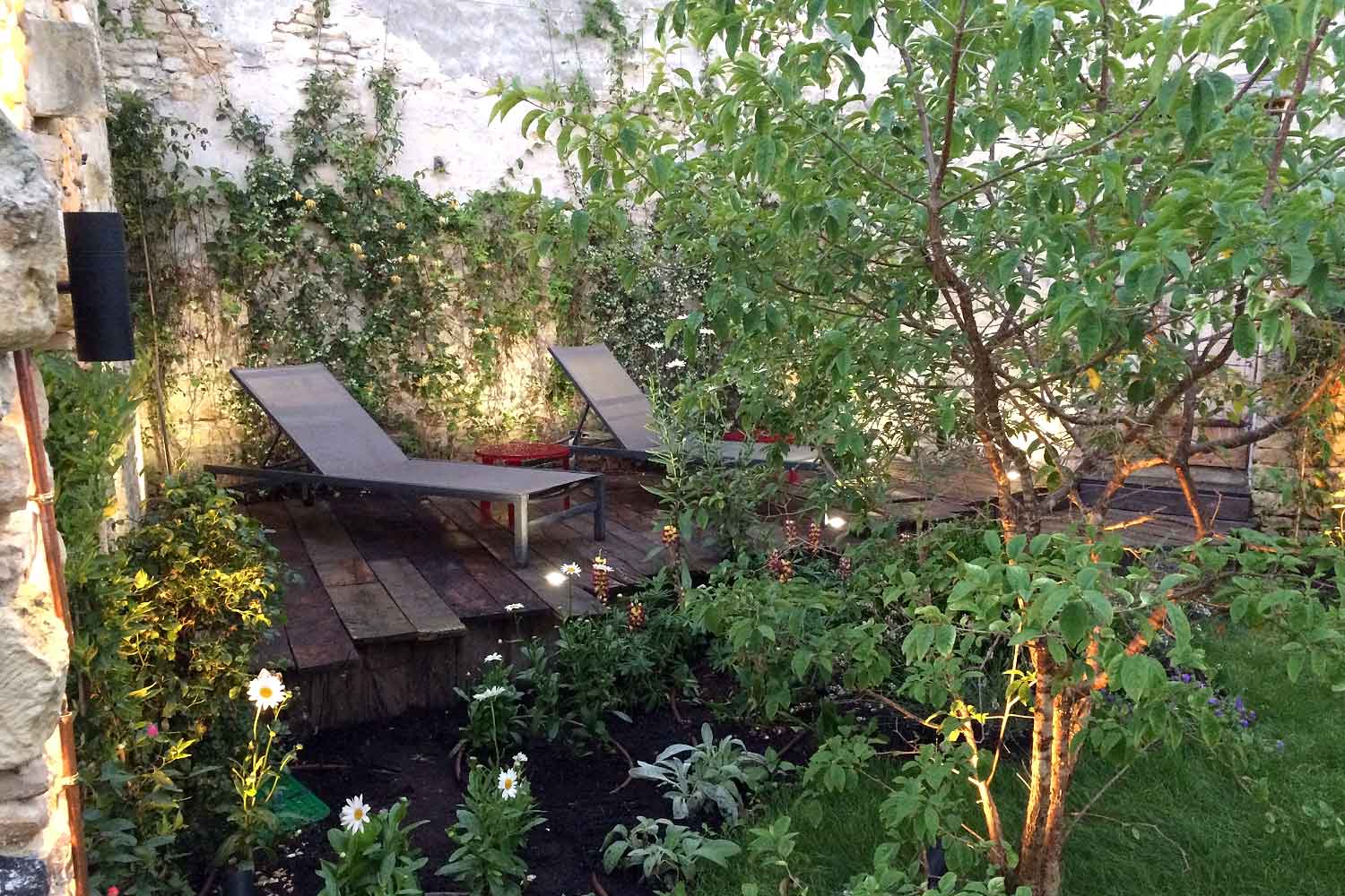 Dans ce jardin pensé sur mesure, chaque détail raconte une histoire : la tête de puits restaurée, les ferronneries artisanales chinées et la terrasse en bois recyclé confèrent au lieu un charme intemporel, comme s’il avait toujours été là.