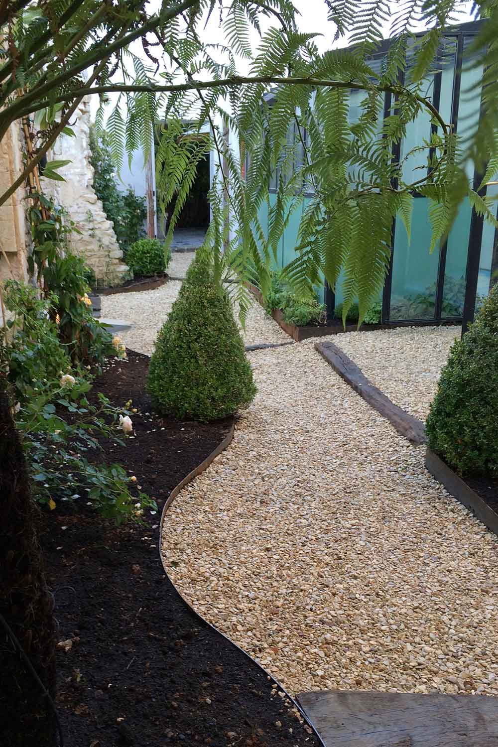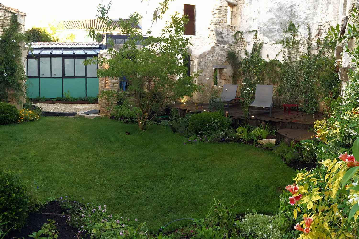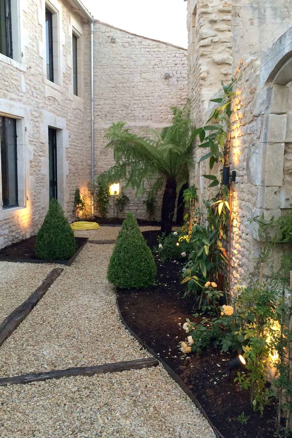 Transformation d'une ancienne grange en jardin, où l’espace a été repensé pour offrir un lieu de détente et de rafraîchissement. Un point d’eau a été créé, apportant fraîcheur et harmonie, tandis qu’une coursive a été aménagée pour favoriser la circulation et l'accès à différents coins du jardin. L’ensemble a été soigneusement végétalisé, afin de créer une atmosphère agréable et accueillante, où nature et architecture se rencontrent en parfaite symbiose.