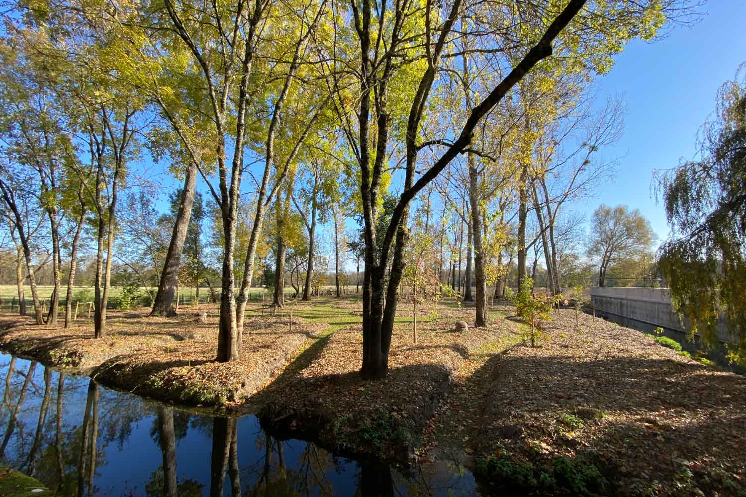 En partie basse du domaine, le canal a été traité comme un axe majeur : il ouvre une perspective longue et structurante qui conduit le regard à travers un parc à l’anglaise aménagé sur d’anciens champs de maïs, offrant à la fois calme et élégance paysagère.